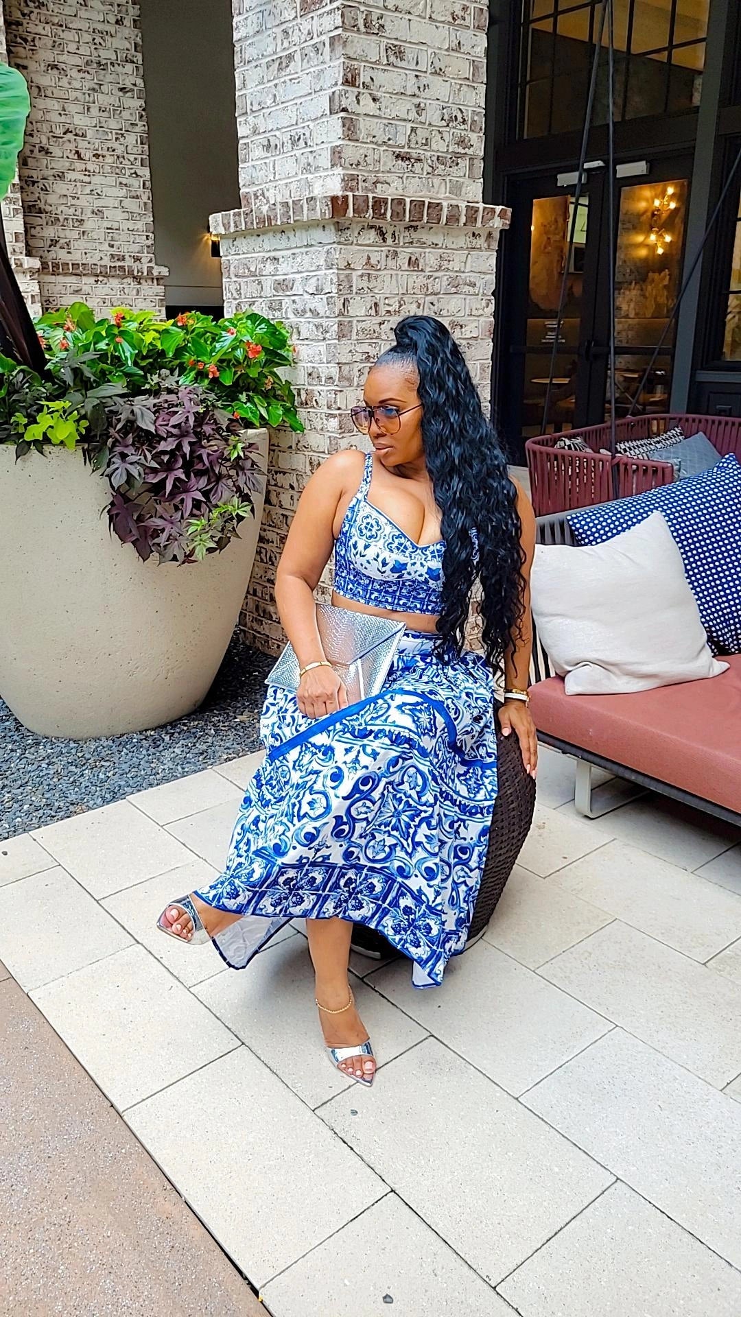 WHITE BLUE PRINT CROP TOP & MAXI SKIRT SET